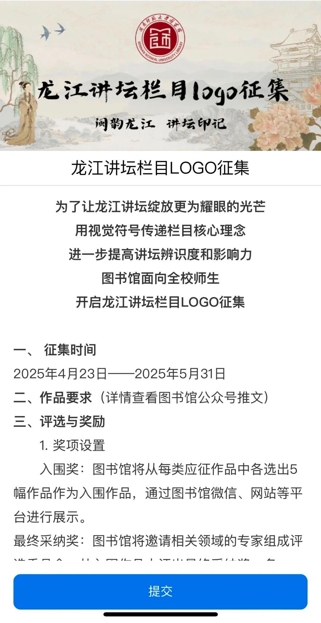 入围奖:图书馆将从征集作品中选出5幅作品作为入围作品,通过图书馆微信、网站等平台进行展示。