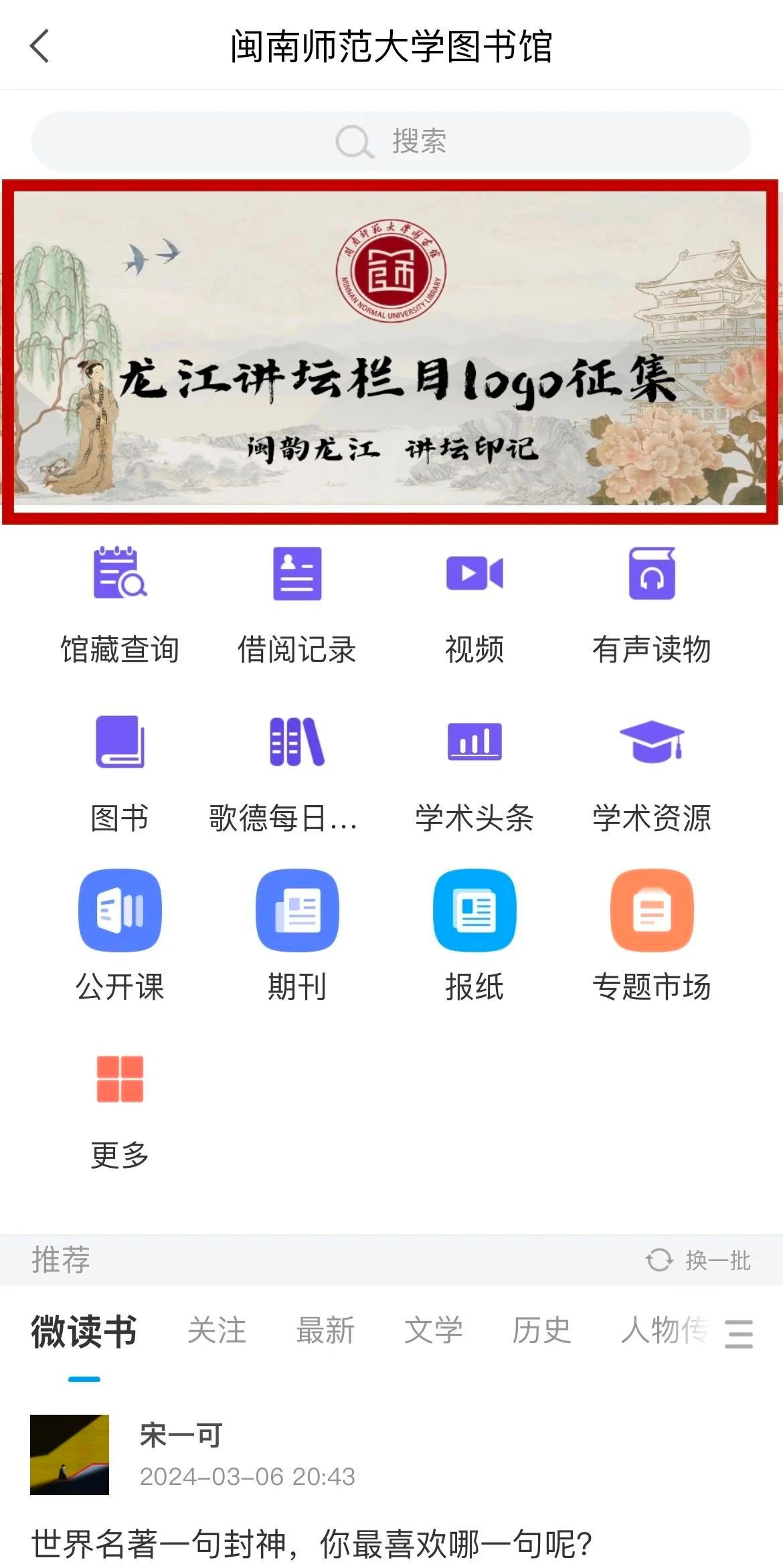 图书馆主办,“龙江”源自九龙江地域特色,传承漳州千年文脉及“龙江精神”,延续朱子文化精髓。讲坛内容涵盖文学经典、闽南文化、学科前沿、形势政策等多元化主题,讲坛开设“闽师荐书 好书同行”“闽南文化探寻”“书香圕缘”等特色子项活动,致力于提升师生综合素养,弘扬学术传统。