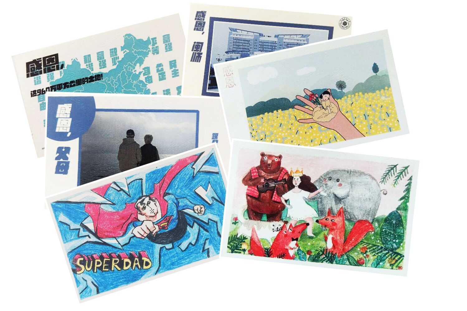 所有的学生。参赛选手可以提交电子版设计或纸质版手绘作品。经过半个多月的作品征集及筛选,最终选出了六张最具特色的感恩明信片,并对作品进行批量印刷。