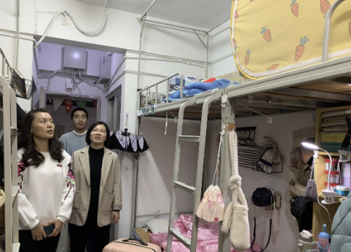 学生宿舍进行了深入走访,在查看宿舍环境及学生返校情况的同时,与同学们进行了亲切的交谈,认真倾听各间宿舍的诉求。