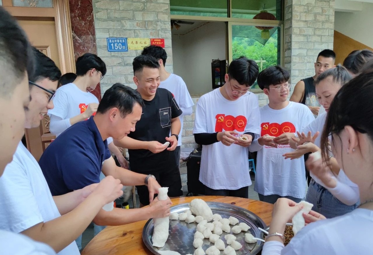 团队成员一起走进乡村,体验西际村特色美食——米粿的制作过程。成员们各显身手,围在一起打米浆、包米粿、聊家常,其乐融融。