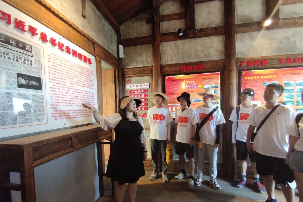 团队成员在莘口村团委书记王婧轩的带领之下,一起重走红军路,重温红军史,了解红色故事。王书记结合“建党百年”主题创作,重点介绍了习近平总书记在西际村调研的重要指示、余氏家训文化及西际村发展的蜜桔高位嫁接技术。现今,在党和国家政策的支持下,2021年度西际村农民人均可支配收入55000元,人民生活水平逐步提高。通过实地学习,让成员们进一步了解西际村的发展历史,为进一步理解创作主题奠定基础。