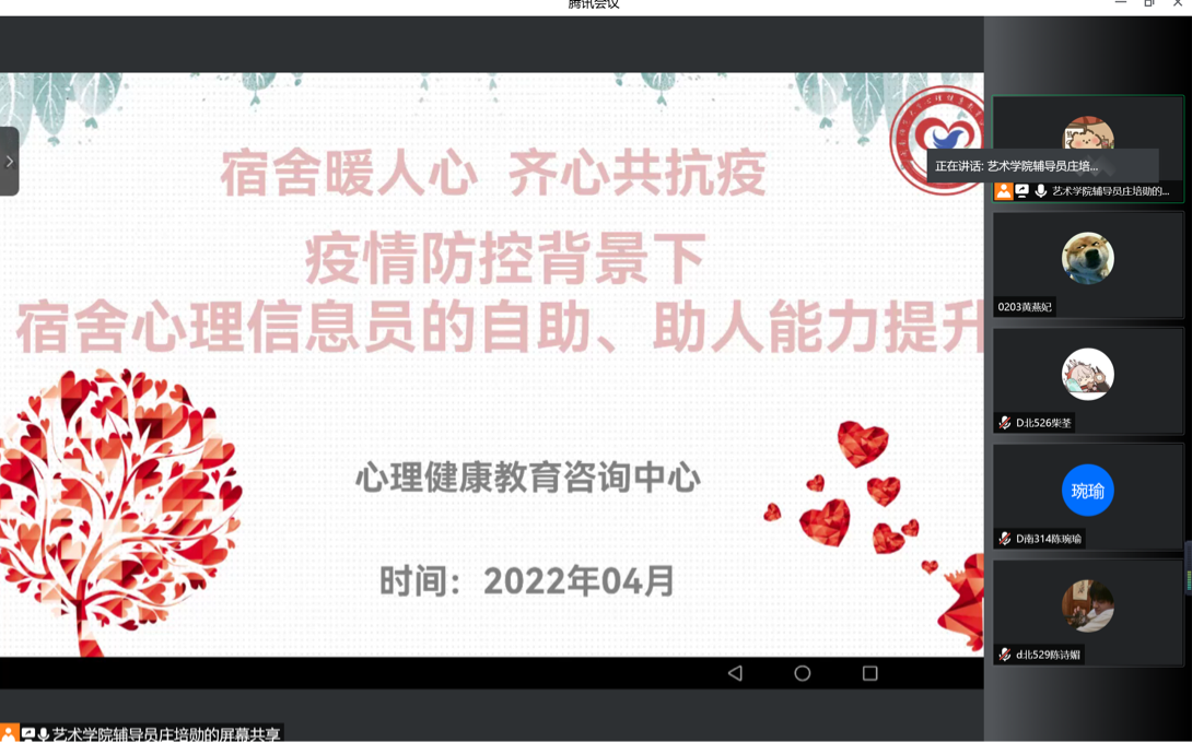 于线上举办了主题为“宿舍暖人心,齐心共抗疫”的线上宿舍心理信息员培训,针对近期频发的新冠疫情引发的一系列有关的心理问题展开讨论。本次培训由学院心理辅导站站长庄培勋老师主讲。