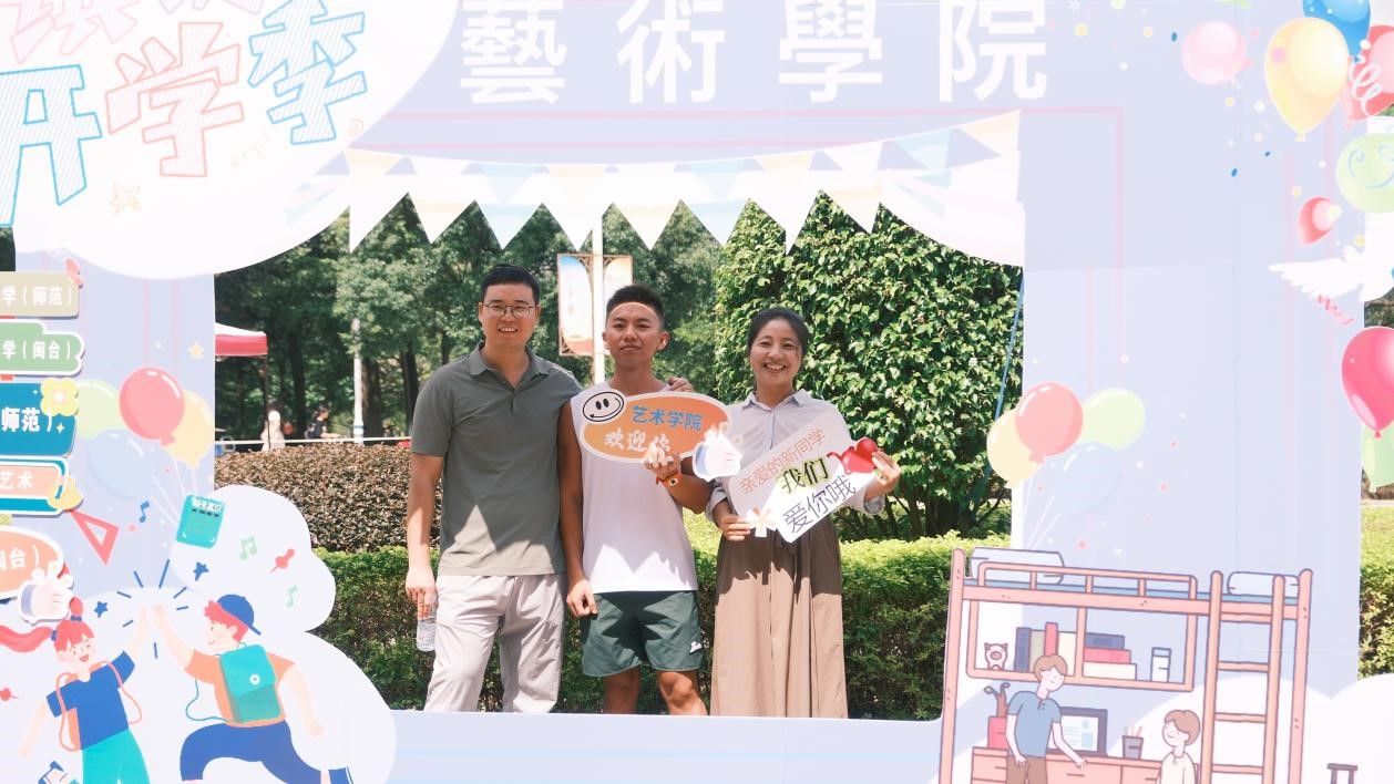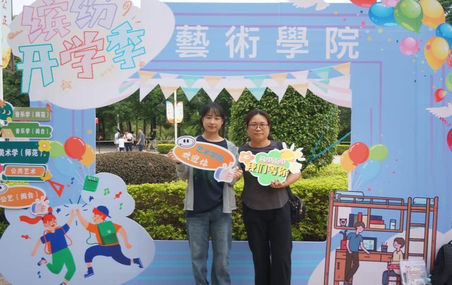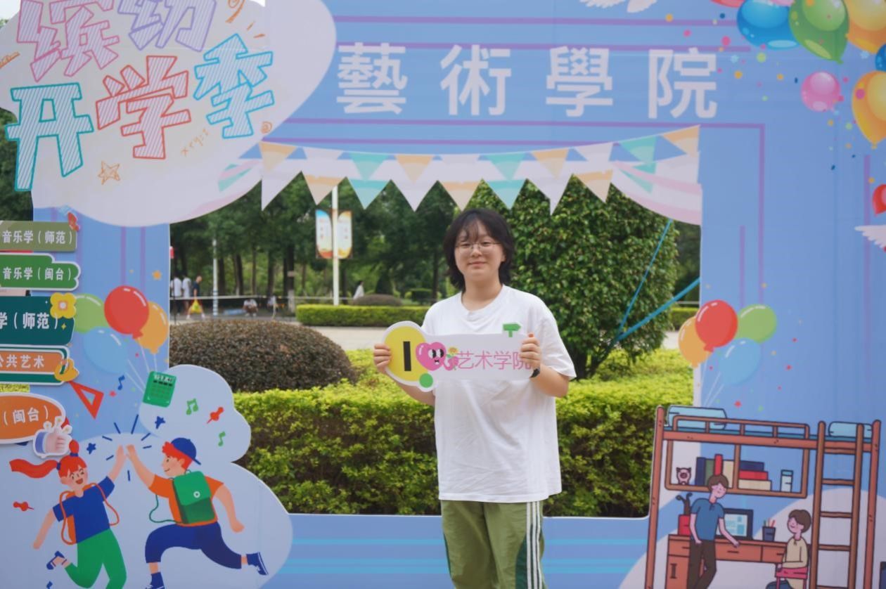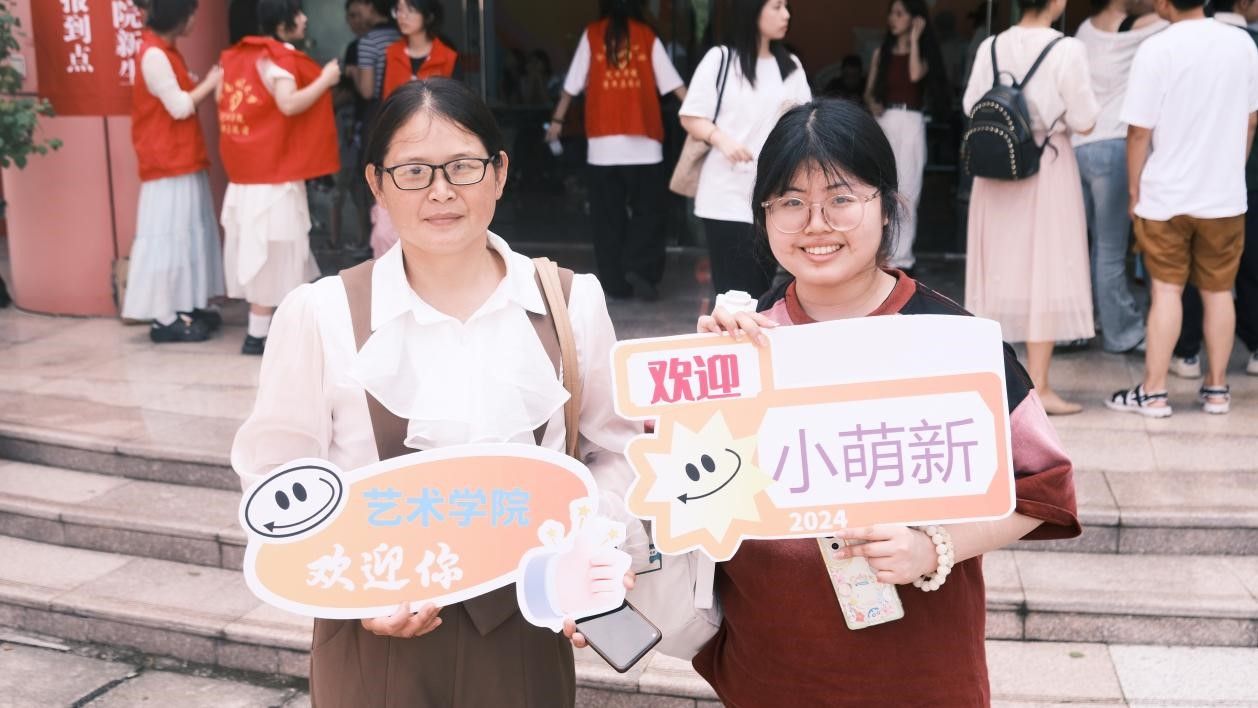 在学院专门定制的特色立牌前,2024级的新同学们在展板前留下了与动漫在线