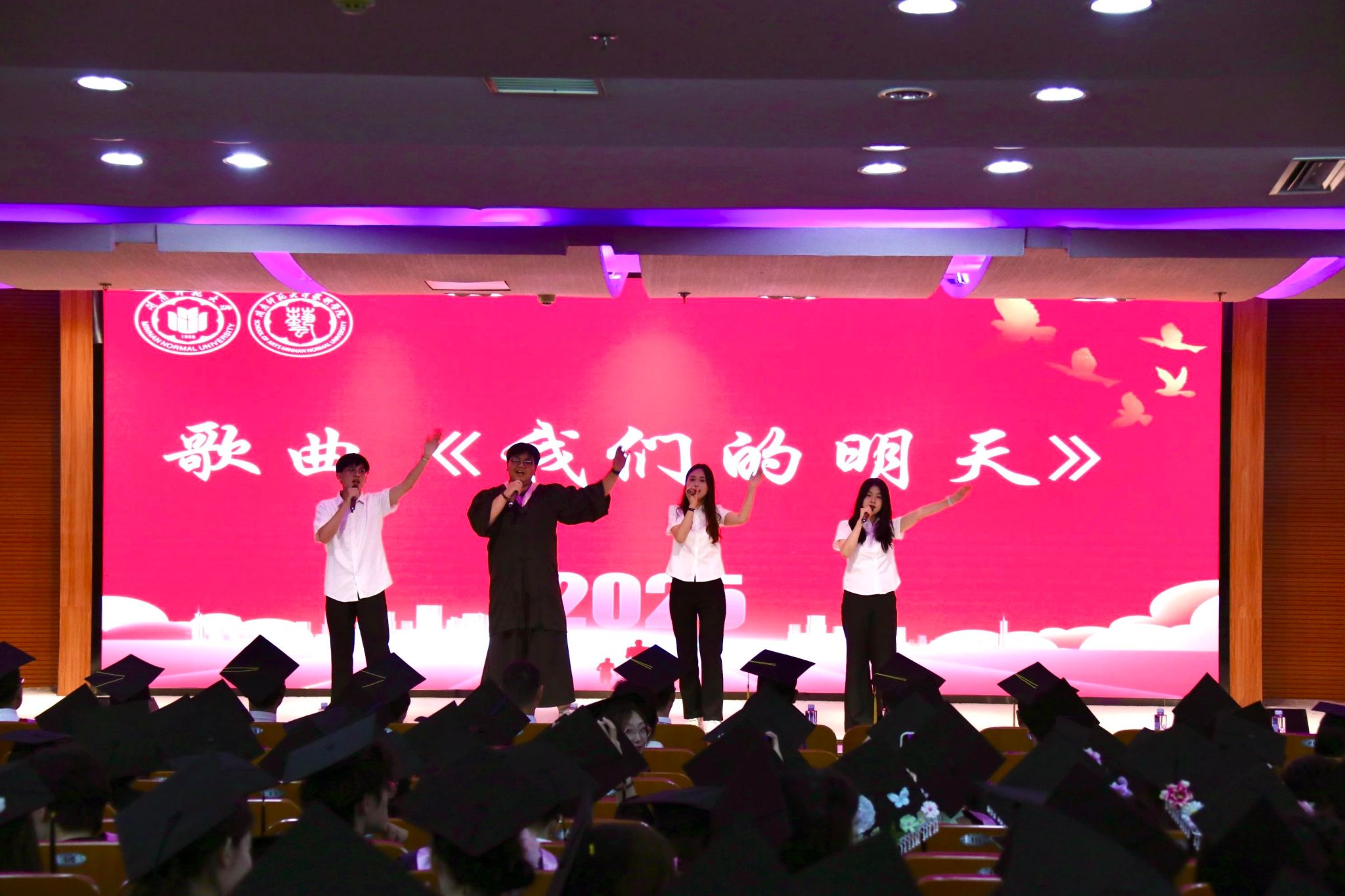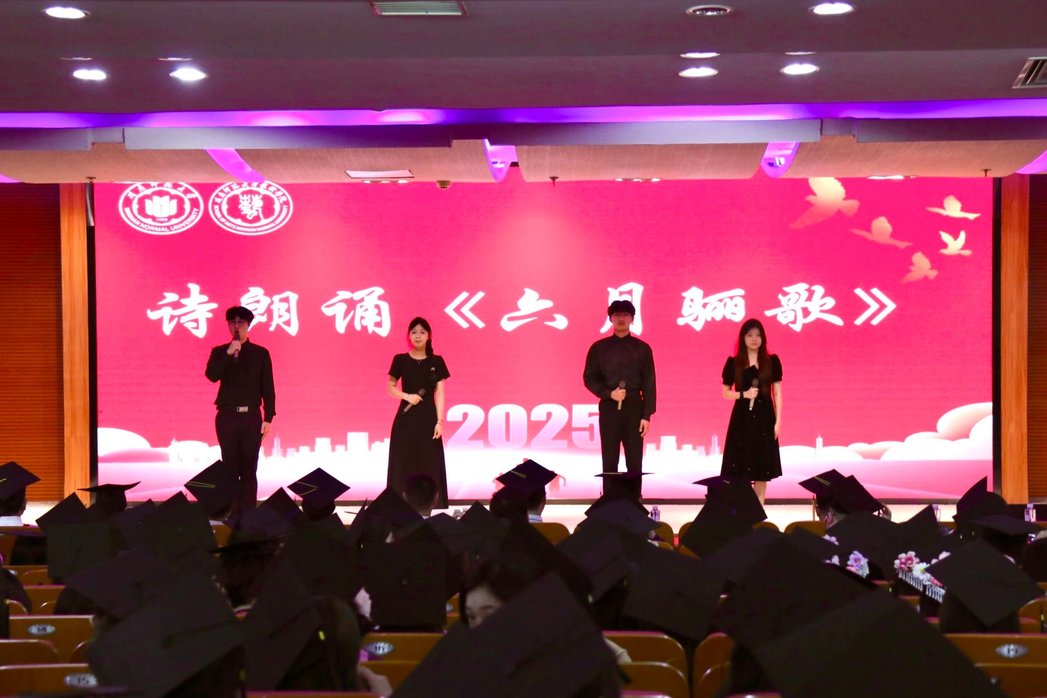 在典礼正式开始前,在校生深情演绎诗朗诵《六月骊歌》与歌曲《我们的明天》,共同祝福毕业生奔赴艺术新征程的荣光时刻