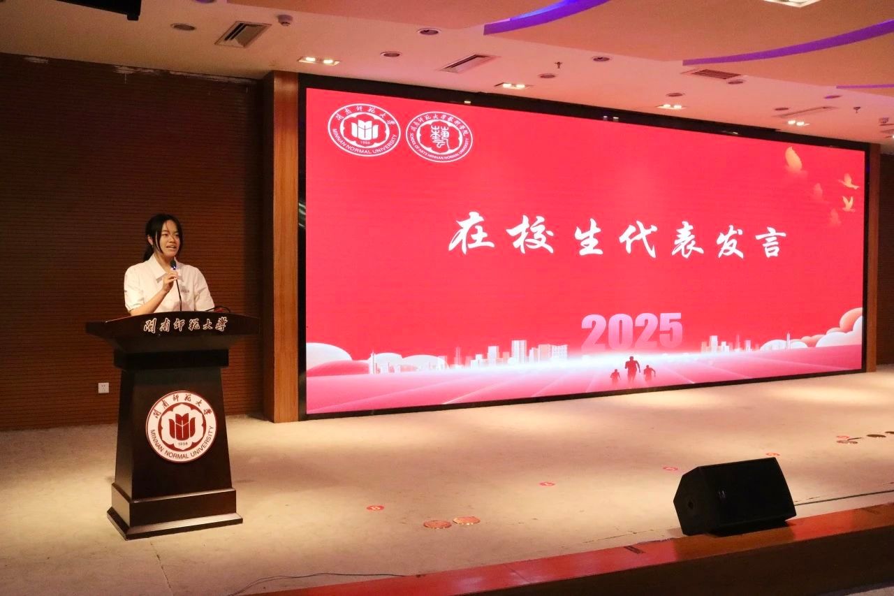 国家奖学金获得者、2023美师3班的陈嘉欢同学代表全体在校生发言。她向毕业生致敬:“你们的今天,正是我们奋力奔跑的方向;你们的背影,就是我们不停追逐的榜样。”她表示将传承学长学姐的“求真足迹、创新火花与奉献热情”,让闽师精神薪火相传。