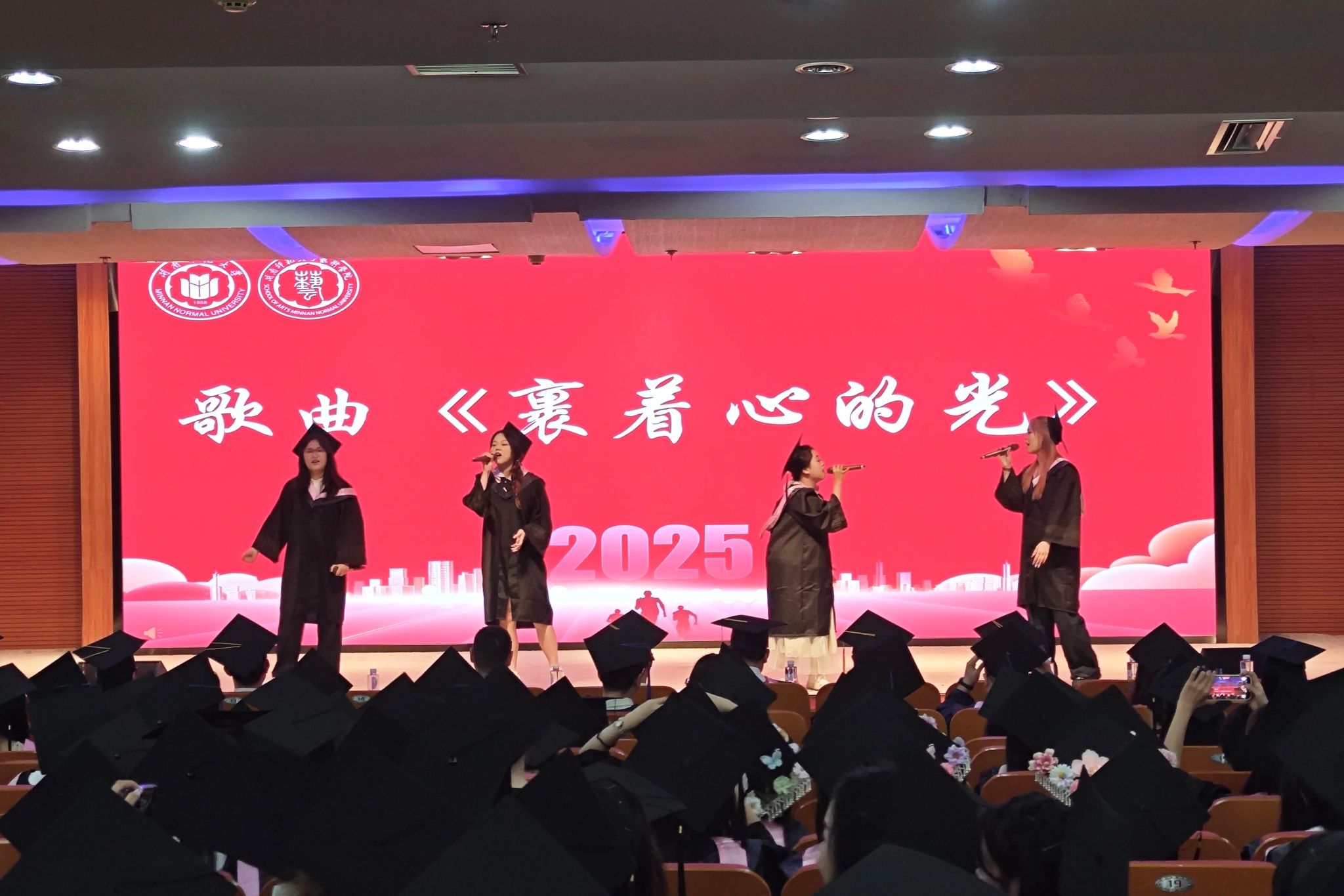毕业生代表献唱歌曲《裹着心的光》,清澈歌声中流淌着对母校的眷恋与对未来的期许。