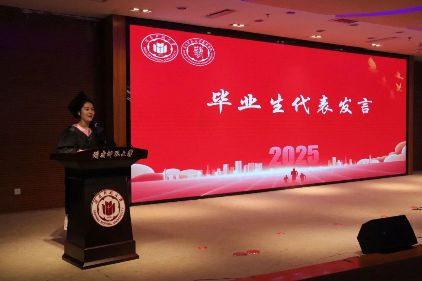 21美师1班的曹蕾同学代表全体毕业生发言。她回顾了在闽南师大的求学时光:“从‘握笔’到‘创作’的蜕变之旅,母校教会我们不仅是技法的精进,更是‘坐得住冷板凳’的匠心。”她承诺将秉承校训精神,“以心为墨,在更辽阔的天地间画出时代的山河新章”。