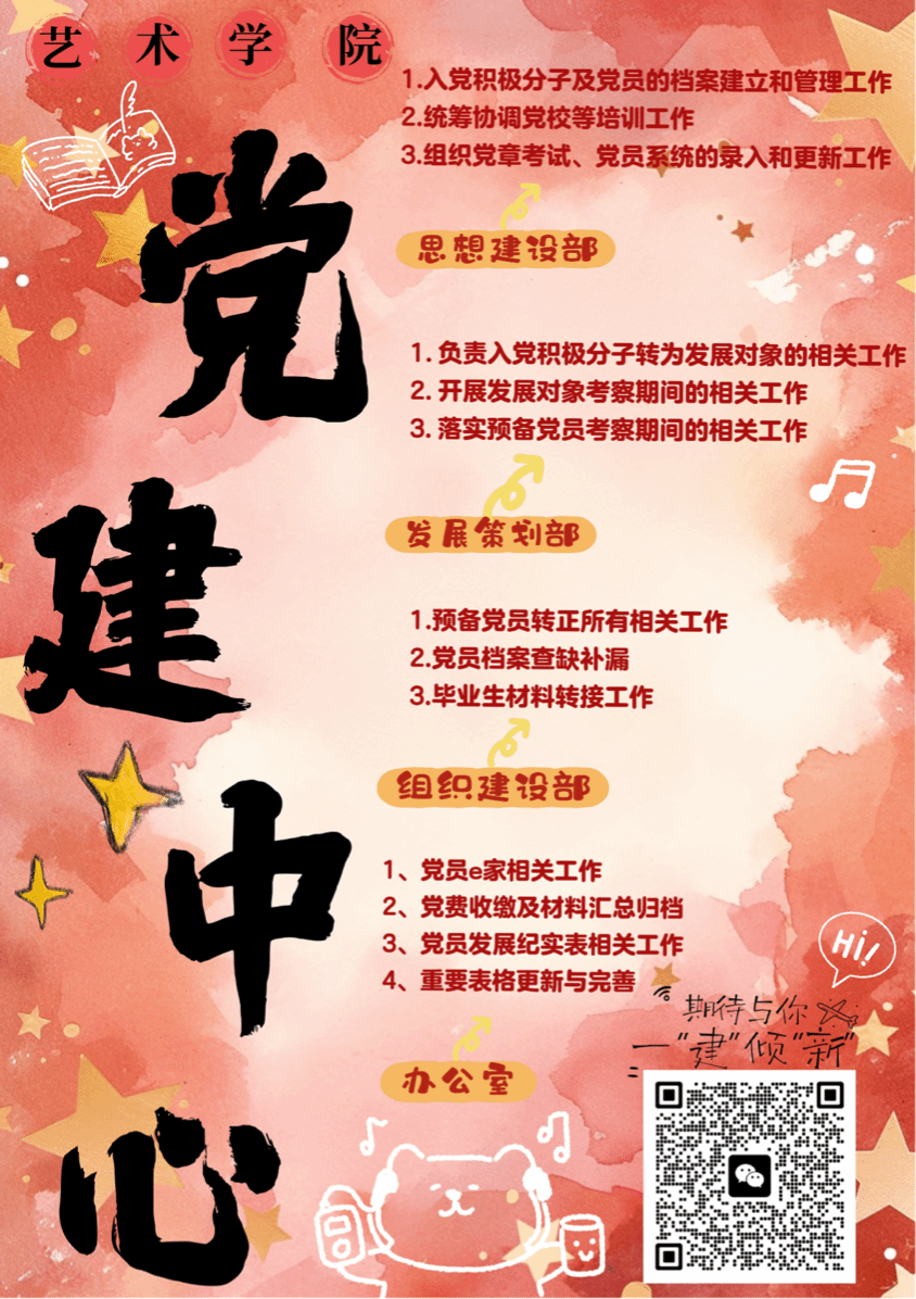 动漫在线 学生党建中心坚持以习近平新时代中国特色社会主义思想为指引,在学院党委的领导下,由党委组织员担任指导老师,负责开展党员发展培养、教育管理等相关工作。充分发挥学生党员“自我教育、自我管理、自我服务、自我监督”的作用,实现党建与专业双提升,思政与育人双融合。党建中心下设思想建设部、发展建设部、组织建设部和办公室四个部门。