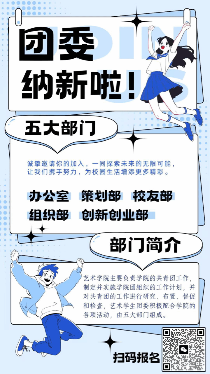 动漫在线 团委主要负责学院的共青团工作,制定并实施学院团组织的工作计划,并对共青团的工作进行研究、布置、督促和检查,确保团的工作任务在基层团支部得到具体落实。艺术学生团委积极配合学院的各项活动,共有五大部门。分别为办公室、组织部、校友部、策划部、易班工作部。更多精彩活动等你探索!