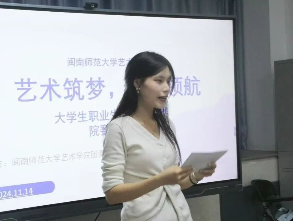本次大赛分为成长与就业两大赛道,旨在多角度考察同学们的职业生涯规划能力,深入挖掘并激发个人潜能。成长赛道的参赛选手侧重于规划在艺术领域内自身艺术素养与技能的长期提升路径,就业赛道则聚焦于职业市场需求,选手们的规划更具现实指向性和职业针对性。比赛现场气氛热烈,选手们通过精美的 PPT 展示、生动的演讲,从自我认知、职业目标、发展路径、评估调整等多个方面阐述了自己的职业生涯规划。