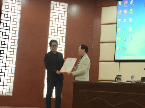 客座教授聘书。随后仪汤志义教授进行了“大漆之美——中国漆画艺术漫谈”的讲座。汤志义教授与现场学生分享“大漆之美”,介绍了目前中国漆画创作的特点,指出中国漆画源自古老的漆文化,并且融合了当代绘画的审美理念和造型语言而形成的一种架上绘画形式。漆画本体语言视觉审美效果在材质、色泽、韵味上独具东方艺术特色,是一门既能代表悠久厚重的中国艺术风范,又能代表当代中国艺术、中国精神的画种。并结合自身成长经历,讲述创作经历,强调大学生要有坚持创作,矢志不渝的决心。作为从事漆艺术研究的作者,一定要有广博的知识积累,多看、多阅读、多交流,寻找传统与当代元素的契合点。漆艺是独具东方审美品格的艺术,漆艺术作者要树立东方文化的自信,从本国文化体系出发融入当代进行创作。