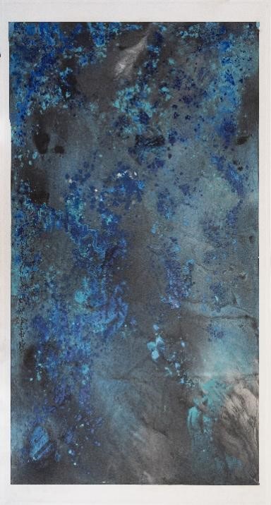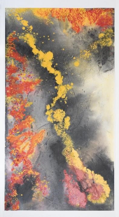 构建生命哲思与科学理性的视觉对话。《秋瑟红叶》以红黄暖色与心形构图为喻,揭示生命“形逝神存”的永恒;《林籁泉韵》以墨色模拟声波,演绎阴阳调和,叩问生命韵律;《雾杳透斑斓》借微粒弥漫构建细胞与星云间的超维空间,于朦胧中探寻生命真相。
