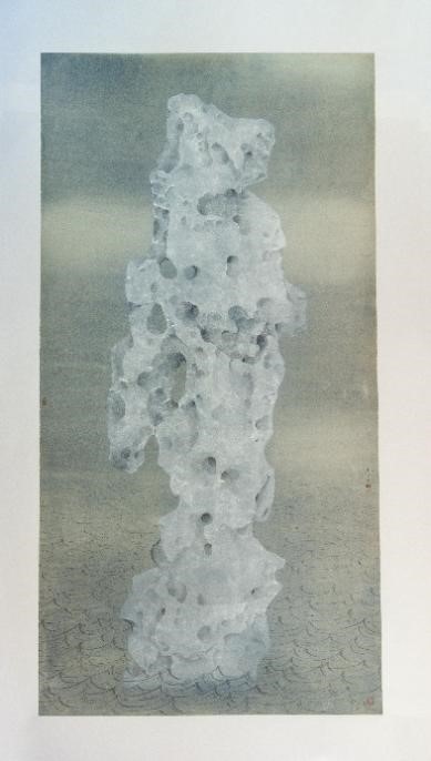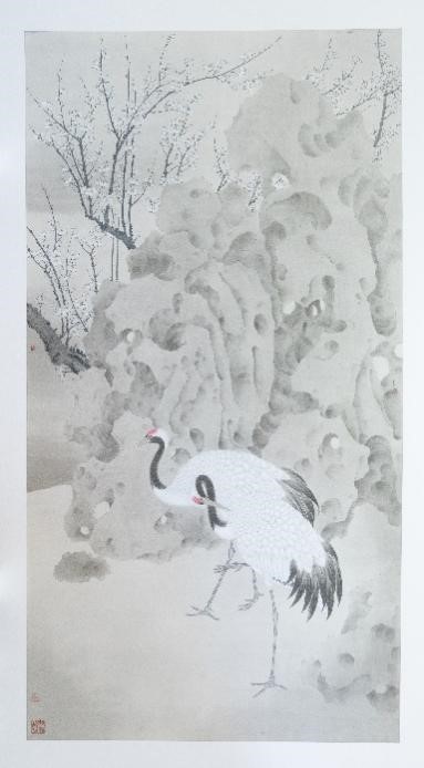 以精微技法重塑传统意象,构筑视觉诗境。《湖石》枯润相间,勾勒石之形质,传递水石灵韵;《秋水》线条疏密有致,捕捉涟漪静谧,营造落霞孤鹜诗境;《闲庭鹤影》以水墨凝练鹤之超逸、石之坚毅、梅之清雅,构建一方悠然世界。