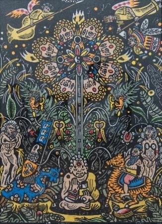 以木版水印技艺为基,承继“饾版”“拱花”传统,突破复制性定位,融入当代语境。通过水韵墨色与西方色彩语言的交融,探讨财富、权力等议题,以水印木刻为文化媒介,焕发古老技艺的当代生命力。