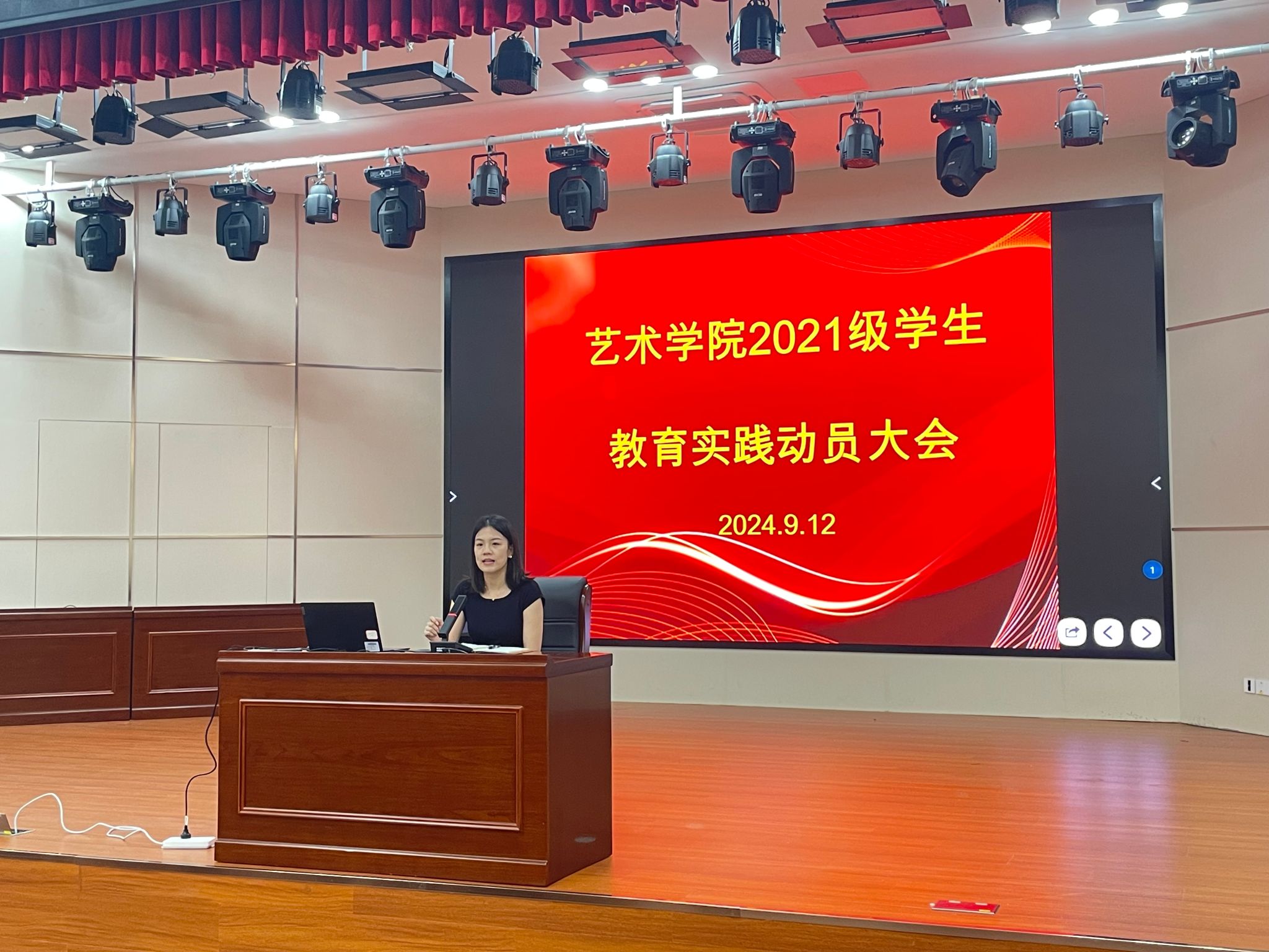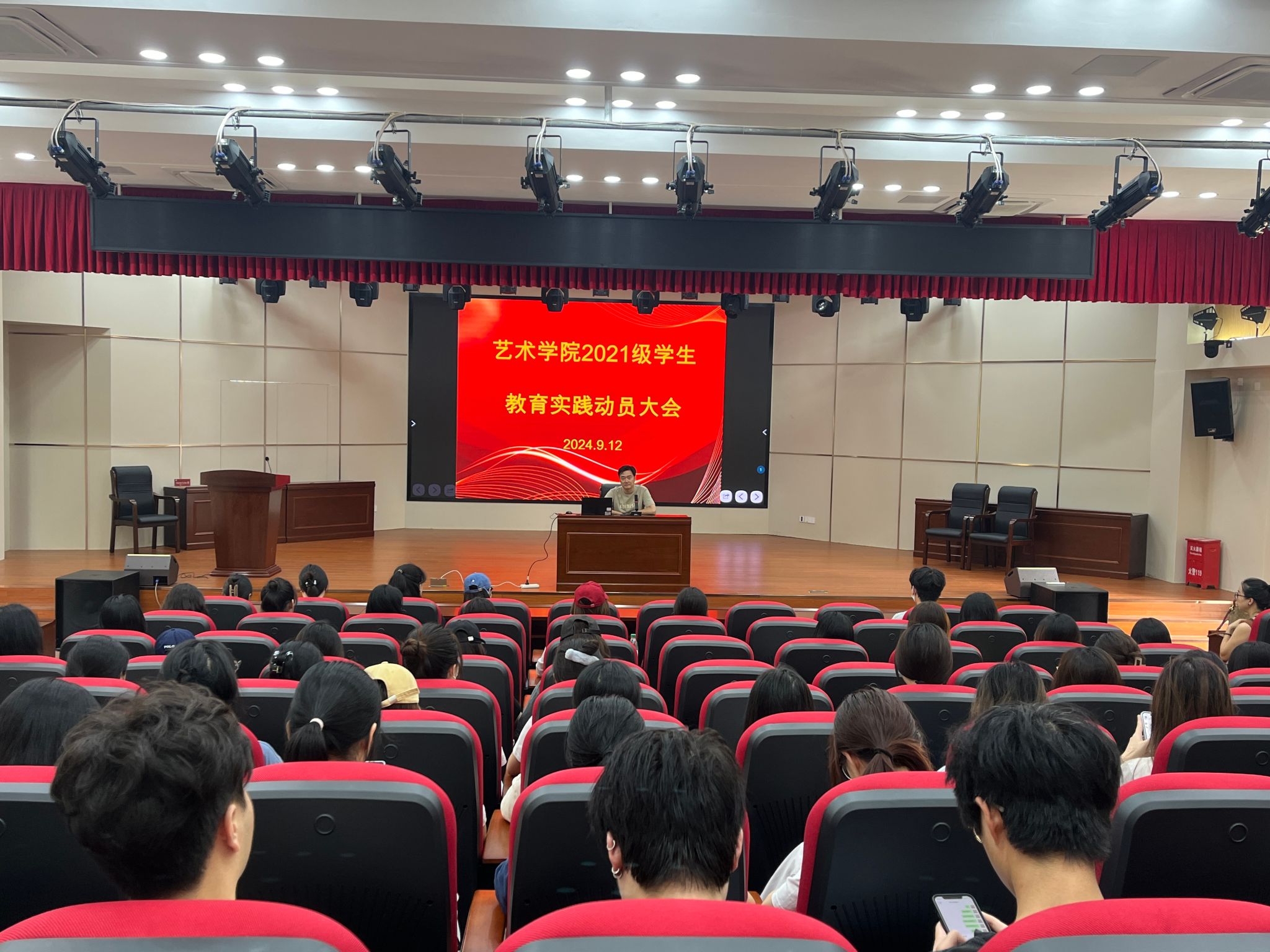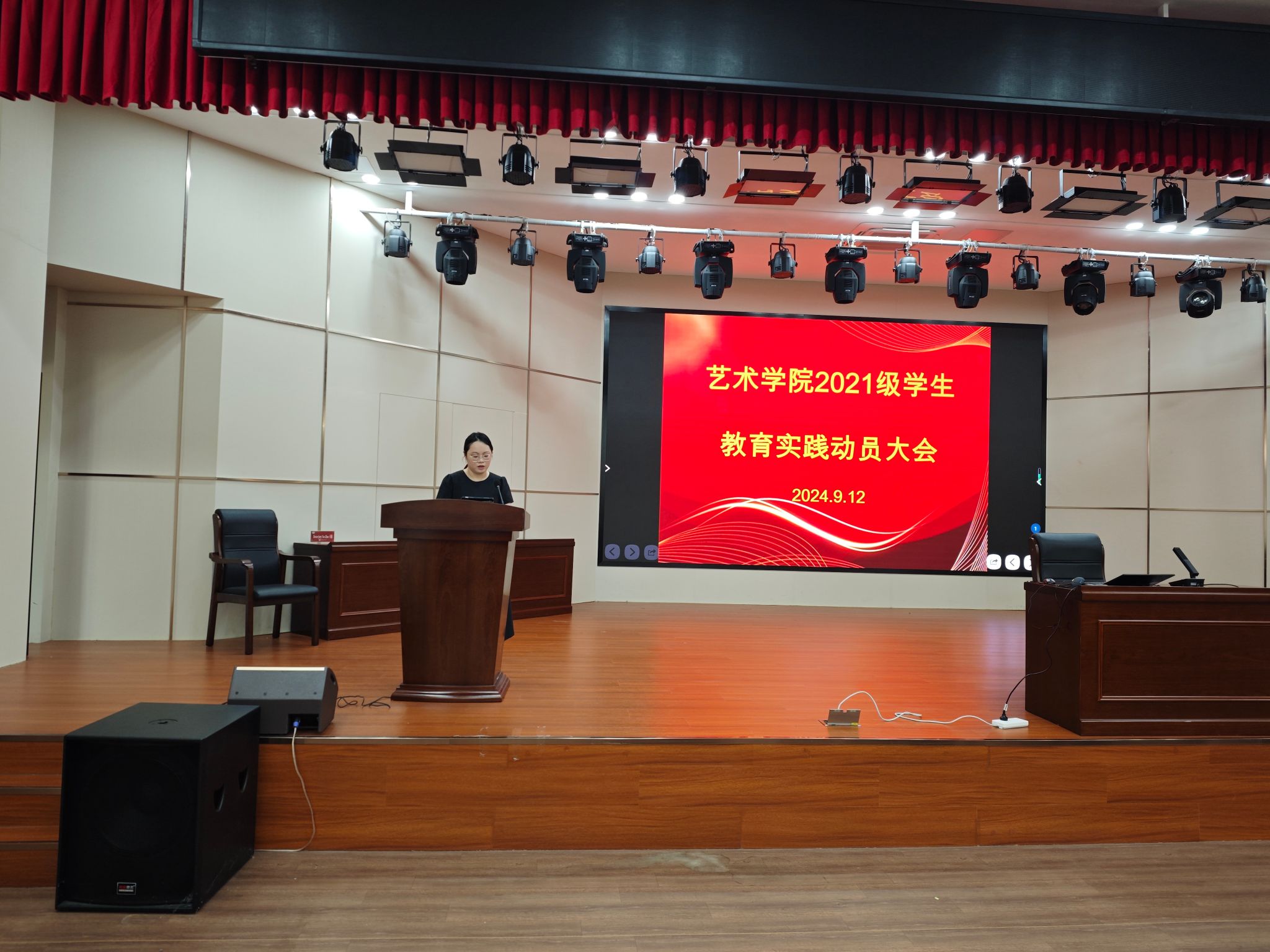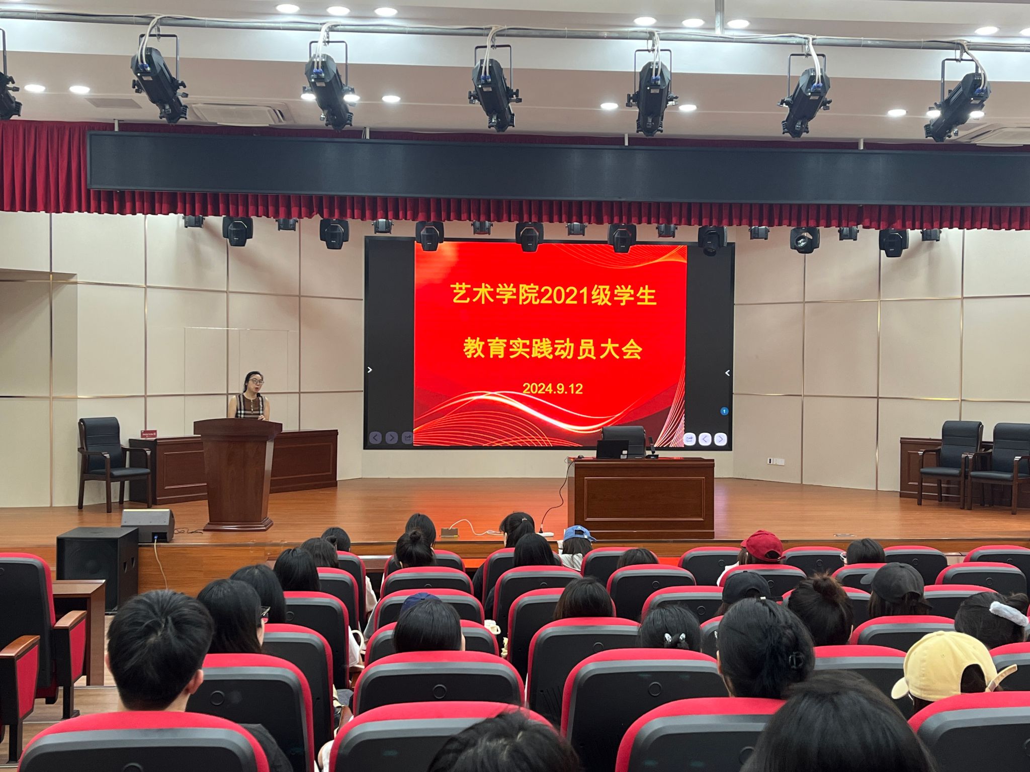 为推进教育实践工作有序开展,激发学生实践热情,引导学生做好实践准备。9月12日,学院在多功能演播厅召开2021级音乐学、美术学师范专业学生教育实践动员大会。各系主任、专业教育实践带队老师、辅导员及全体2021级音乐学、美术学师范专业学生参加了动员大会,会议由教务科科长杨瑾瑜主持。