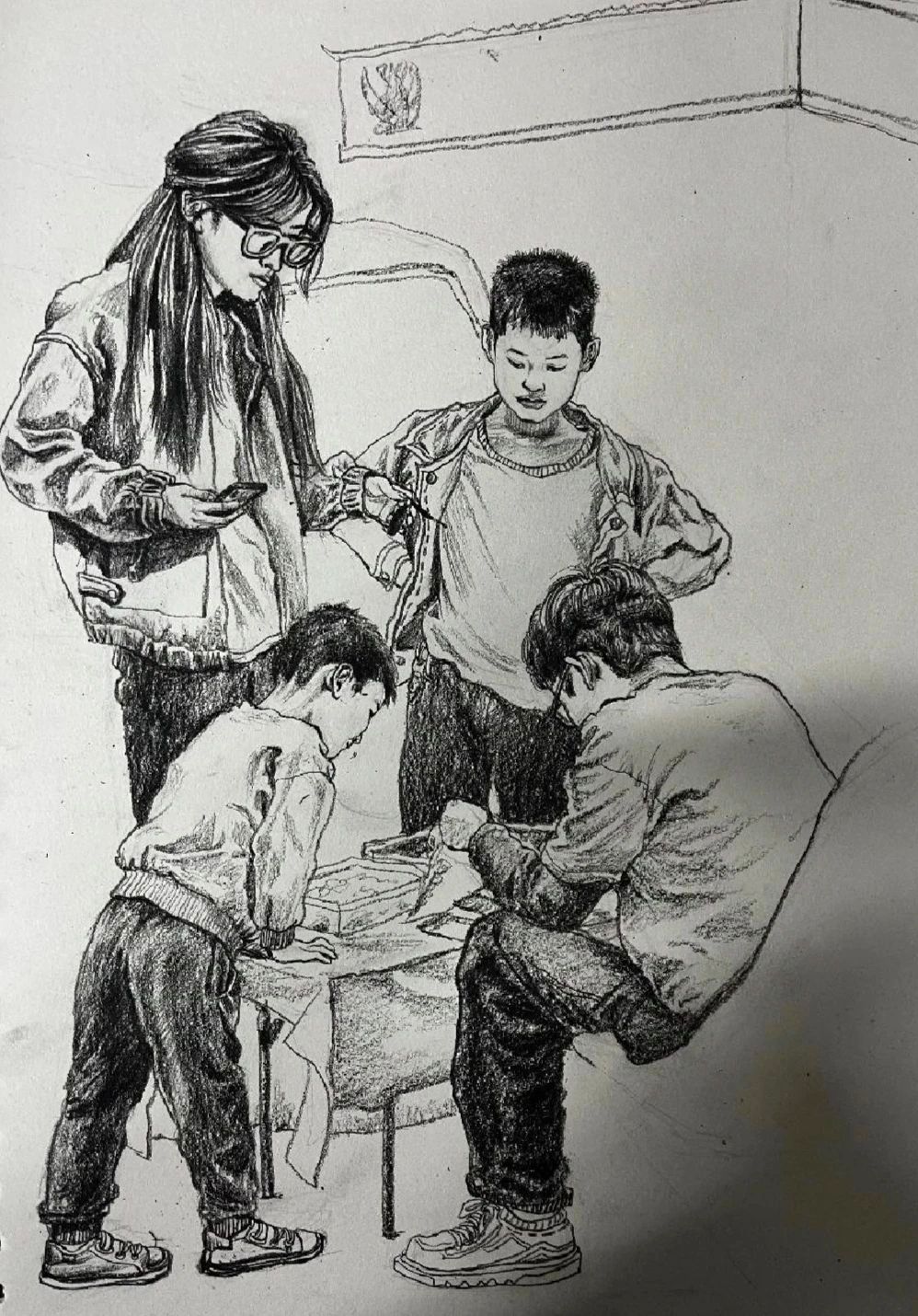 在美术学专业课程体系中,《速写与构图》是专业基础课程,训练学生的观察与表达,以及造型的能力。今年的课程中,要求学生将专业技能运用到现实生活中,描绘社会生活和校园学习图景。旨在通过实践深化提高对生活周边事物美的发现能力,并通过切身体验来激发创作潜能。在为期四周的学习时间里,同学们从刚开始无从下笔,找不到目标物,到逐步掌握速写与构图基本技巧,发现了身边的好多事物都可以拿来做描绘对象,能通过简单事物来表达丰富的内涵。绘画对象从教室的学习用具,学生学习场景,校园一角,食堂,到校外商贩,古城街道等等。他们展现了非凡的学习能力和创新精神以及对美的不懈追求。在这个过程中,同学们用各自不同的表现技巧,将个人情感与创意融入作品中,这些作品不仅展现了同学们的绘画技巧,更体现了他们对生活的热爱,对美的独到见解和深刻感悟。
