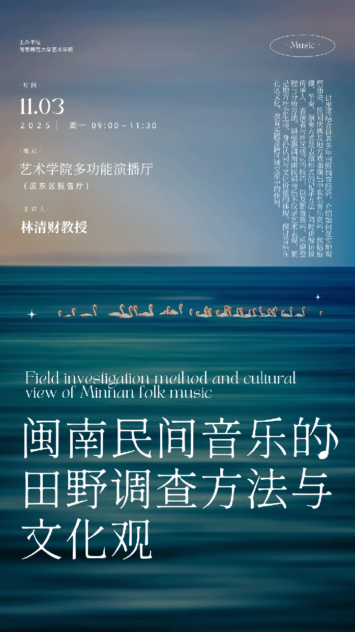 聚焦两岸闽南音乐文化教育的当代表达,从田野方法到文化观念,深入探讨“同源音乐”的多维演化逻辑,以“田野调查视角下的两岸闽南音乐文化教育研究及方法与文化观”为题开展专题讲座。诚邀广大师生与学界同仁,共赴这场跨越海峡、回望根脉的音乐文化盛会。