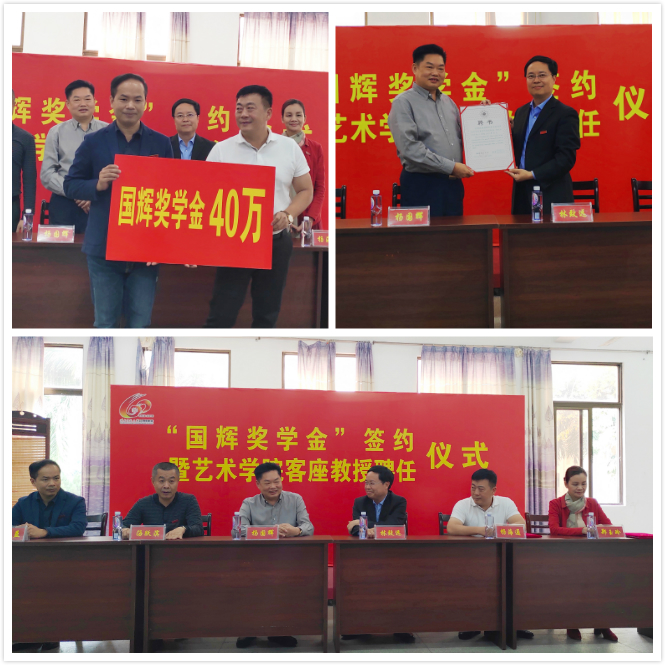 捐赠40万元设立“国辉奖学金”签约暨客座教授聘任仪式在学院二楼会议室举行。林致远副校长出席仪式并致辞。国辉工贸集团董事长杨国辉、总经理杨海通,学院副院长郑玉玲教授、美术与设计系主任朱三益老师出席了本次活动。仪式由院党委书记汤跃滨主持。