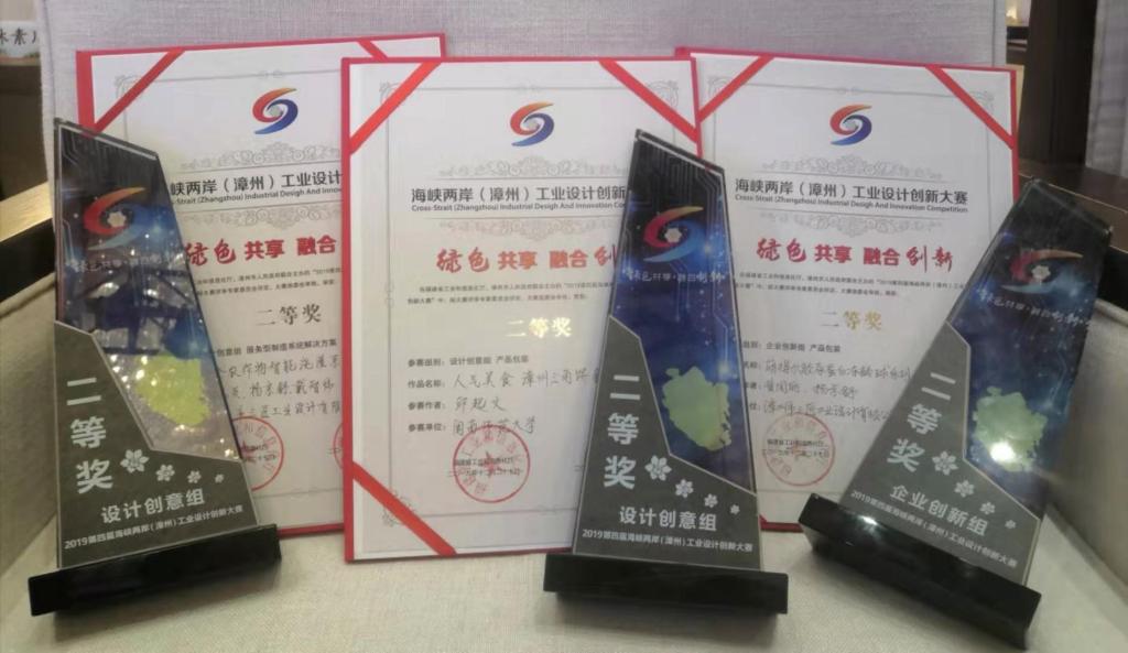 杨伯垲老师所指导,刘莹莹、黄雯婧同学与华森集团校企合作项目《新中式家具—青瓷系列》斩获企业创新家居用品及消费电子组金奖;杨伯垲老师所指导,杨京舒、戴智炜同学与漳州市三匠工业设计有限公司校企合作项目《尼金农作物智能浇灌系统服务型系统制造方案》获设计创意服务型制造系统解决方案组银奖;黄周丽、杨京舒同学与漳州市三匠工业设计有限公司校企合作作品《萌得尔胶原蛋白冻龄球系列包装》获得企业创新产品包装组银奖。