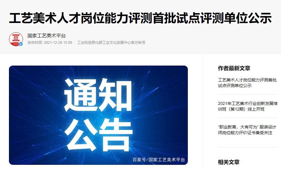 据悉,为贯彻落实国务院职业技能提升行动方案的有关精神,加强工艺美术产业人才队伍建设,工业和信息化部工业文化发展中心联合工业和信息化部人才交流中心,共同组织开展全国工艺美术产业人才岗位能力评价工作,统筹岗位能力评价标准制定,推进全国评测体系建设,并公开征集全国工艺美术产业人才岗位能力评测试点单位。我校动漫在线