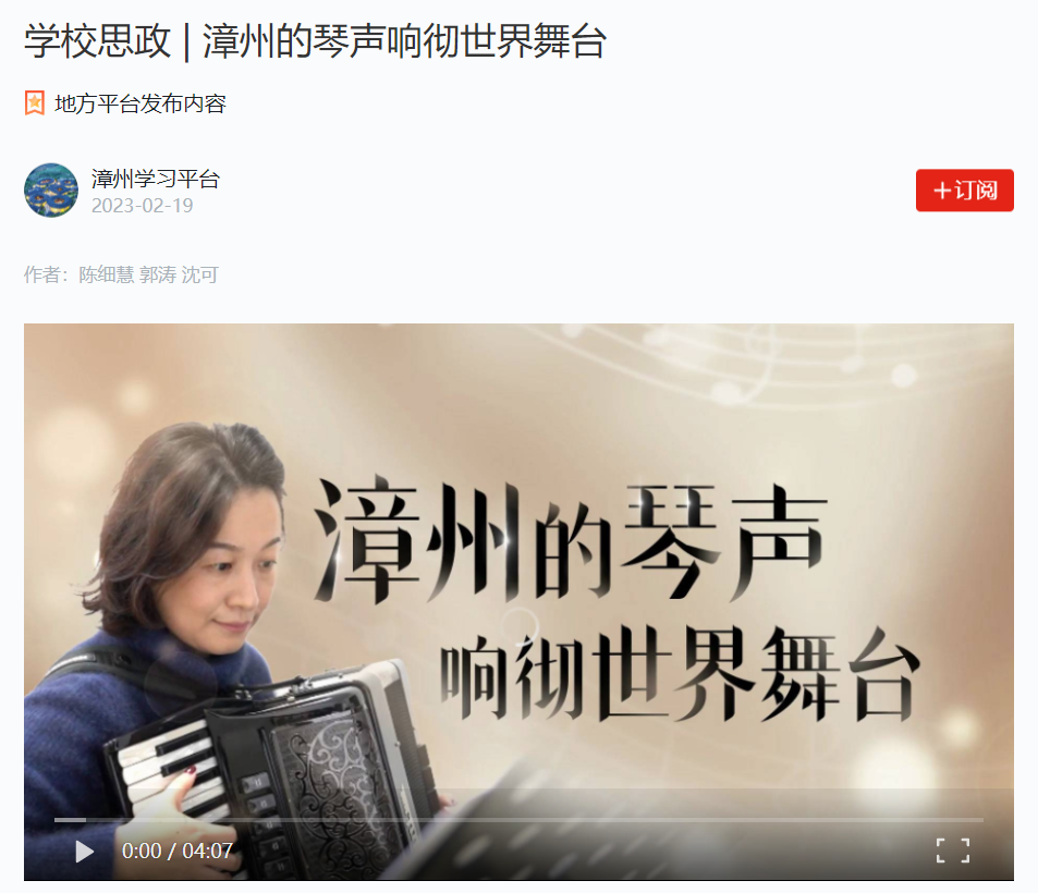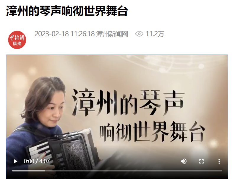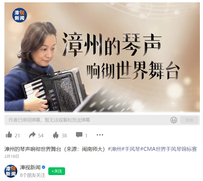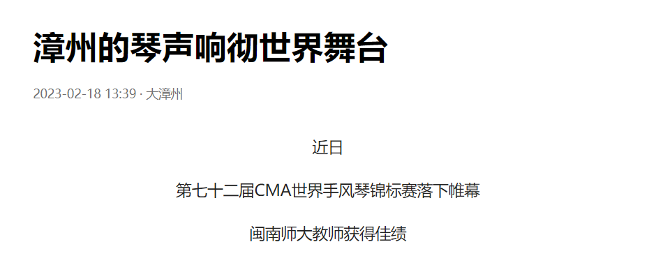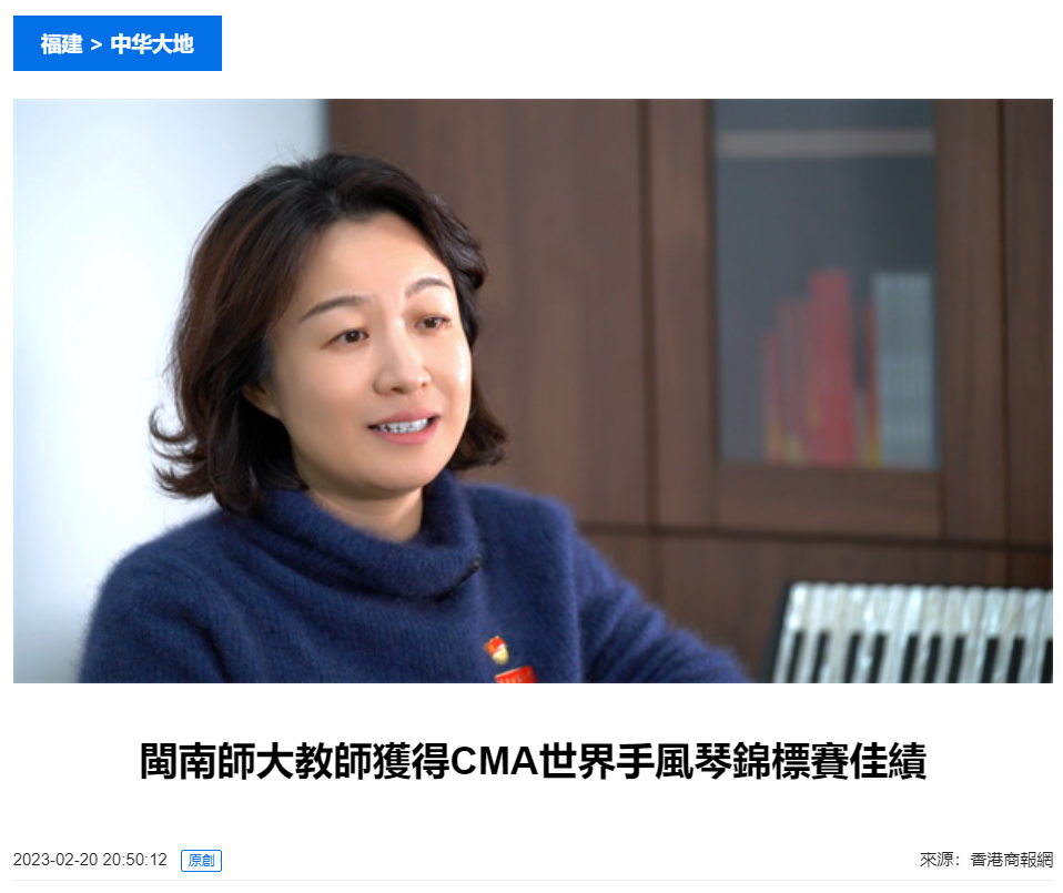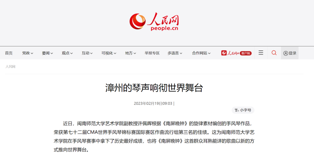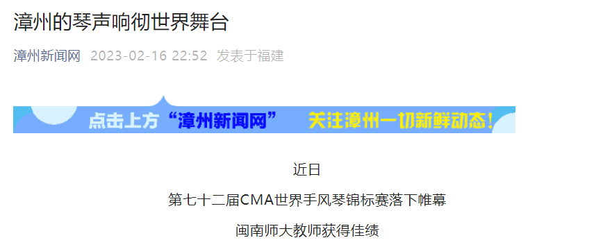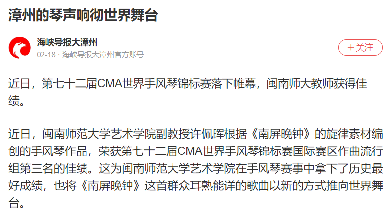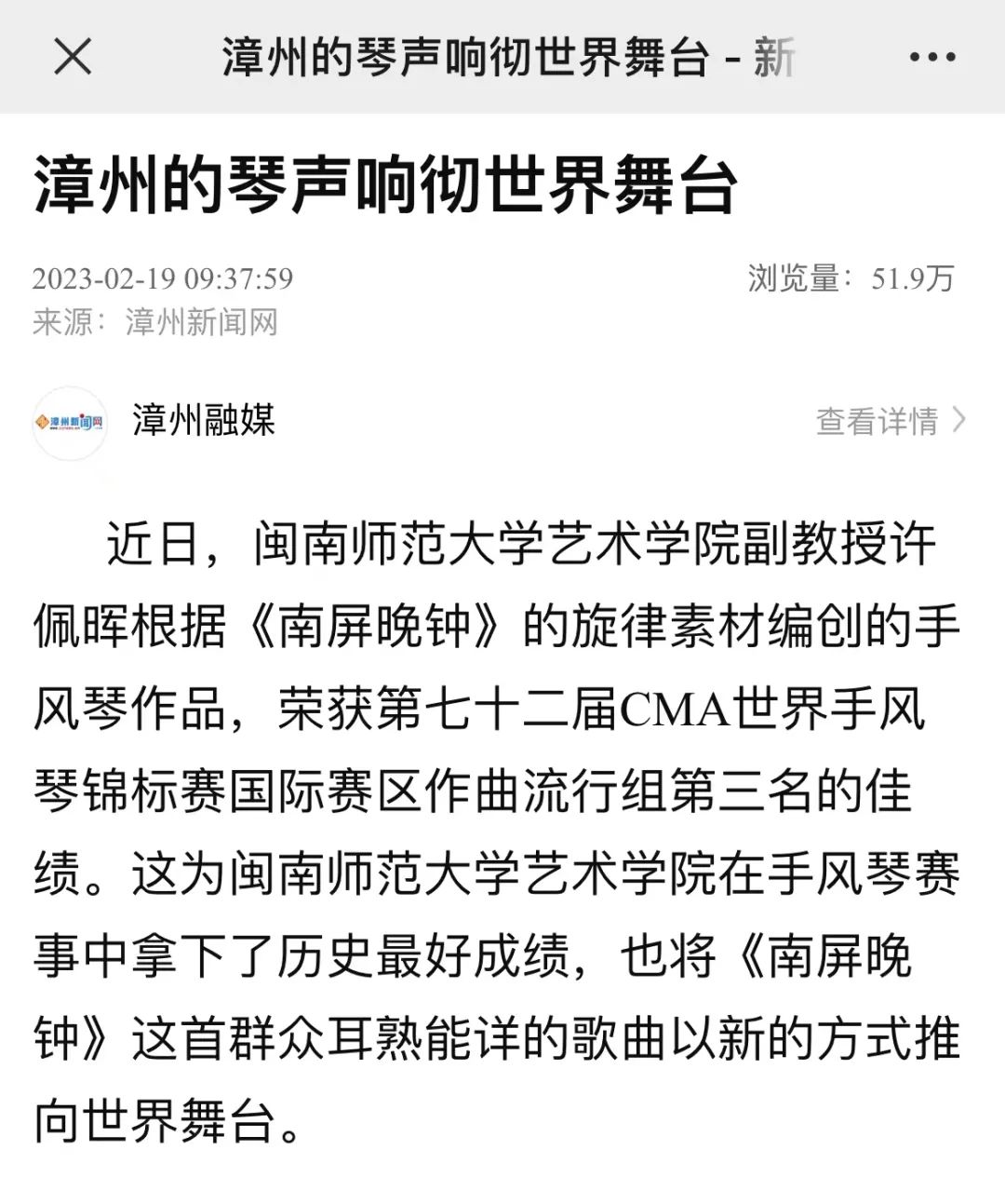 教师许佩晖副教授根据《南屏晚钟》的旋律素材编创的手风琴作品,荣获第七十二届CMA世界手风琴锦标赛国际赛区作曲流行组第三名的佳绩。消息引起新华社客户端、人民日报、学习强国、香港商报新闻客户端等十余家海内外主流媒体关注、报道,引起强烈反响。截止2月24日,媒体报道浏览量累计近百万,其中新华社客户端浏览量超50万。