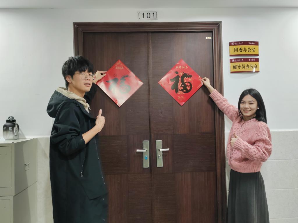 “艺”起送“福”,送到了同学们手中。有的同学将它贴到了宿舍门上,为宿舍增添新年的氛围;有的同学将它贴到了教室门上,教室中洋溢着喜悦的气氛。