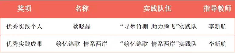 提交的“绘忆锦歌 情系两岸”社会实践专项和“寻梦竹棚 助力腾飞”实践队学生蔡晓晶,在经过层层推荐、专家评审、网上公示等程序后,荣膺“2023—2024学年福建省寒假主题社会实践活动优秀实践成果”和“2023—2024学年福建省寒假主题社会实践活动优秀实践个人”。