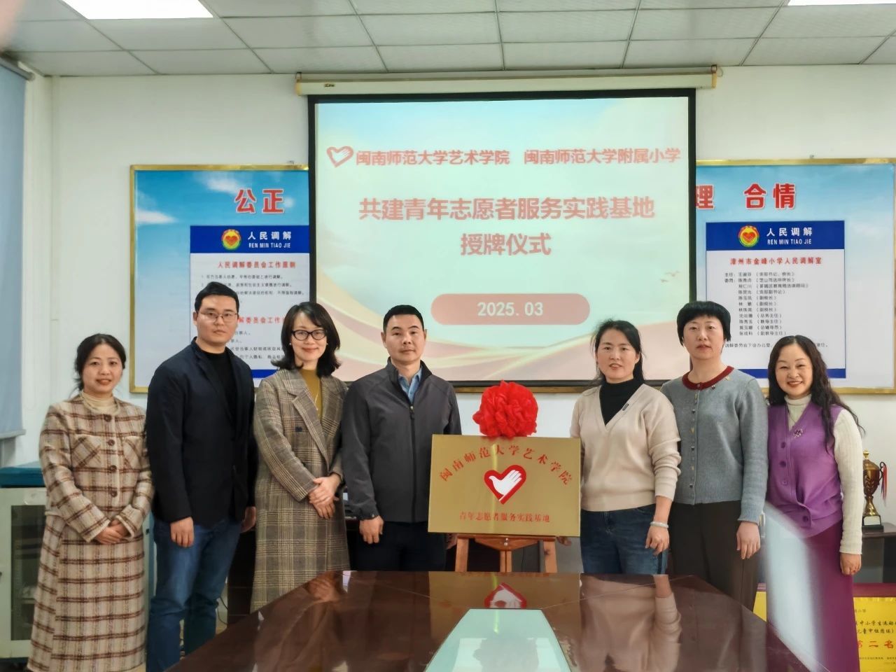 党委书记潘艺阳、副书记胡莉丹、团委副书记李新航以及辅导员代表与附属小学王淑芬校长及校领导班子共同为基地揭牌。这座架设在高校与基础教育间的“艺术彩虹桥”,将推动志愿服务专业化、课程化、常态化发展。