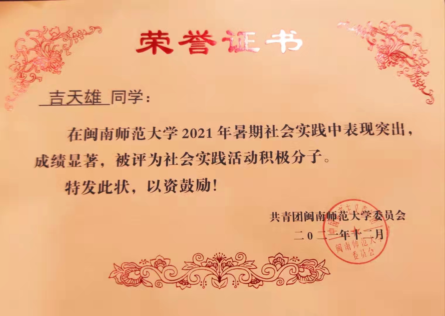 研究生,在校期间创办漳州米粒文化传媒有限公司担任法人代表兼董事长。获得2020-2021年度研究生国家奖学金、2021年度"中国电信奖学金·飞 Young 奖"、第十届福建省“大学生创业之星”,2021年“中国大学生自强之星”推荐人选等奖。第十五届"挑战杯"福建省大学生课外学术科技作品竞赛作品省三等奖,第十一届福建省高校艺术设计奖铜奖等。获得2021全国第十届暨福建省第九届创新创业大赛省优秀企业奖,漳州市人社局大中专毕业生资助项目一等奖等。个人现拥有3项关于乡村振兴方面的软件著作权,1项个人外观专利。吉天雄同志和他的企业主要从事投入乡村振兴工作中,积极响应并“青年红色之旅”、“三下乡”、“返家乡”等社会实践和志愿服务项目,并且在湖南永州、福建漳州、湖北黄冈多地下乡进行社会实践工作,取得很大的社会成效和反映,赢得社会一致好评,发挥专业特长,整合优势资源,实施校企合作。每年免费为学校学生和社会人士教学VR相关技术,在新时代乡村振兴浪潮下为自己家乡的发展贡献自己的力量。