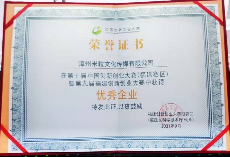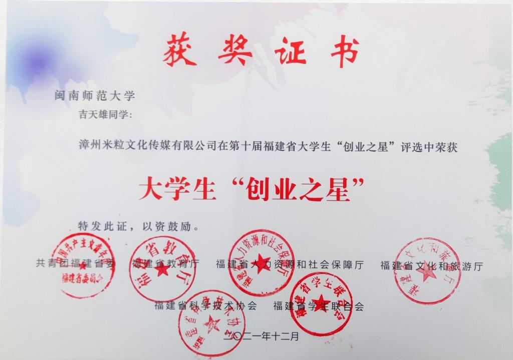 在这期间里,他获得了第十届福建省大学生“创业之星”,2021“大学生自强之星”推荐人选,通过了福建省科技厅第八批科技型中小企业认定,并获得2021全国第十届暨福建省第九届创新创业大赛省级优秀企业奖、福建省人社厅大中专毕业生创业省级资助项目优秀、福建省第九届创新创业大赛漳州市科技局决赛优秀项目、福建省漳州市2021大中专毕业生创业市级资助项目一等奖。