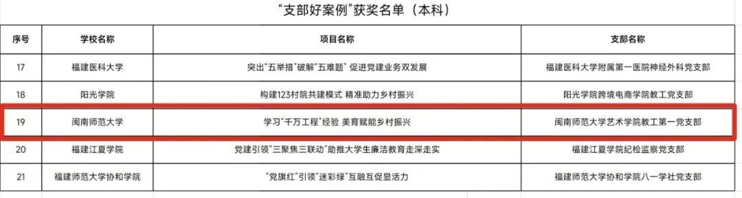 据悉,中共福建省委教育工委关于高校党支部工作“立项活动”优秀成果和“党员好故事、书记好党课、支部好案例”评选活动每两年评选一次,本次活动评定本科高校党支部工作“立项活动”优秀成果80项,“党员好故事”“书记好党课”“支部好案例”各25项。